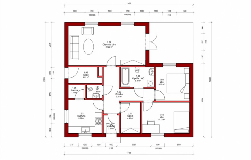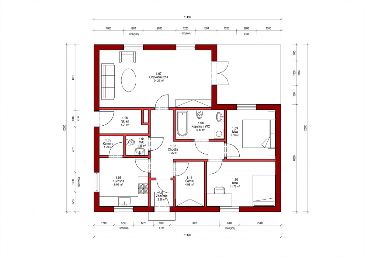 Samostatne stojaci prízemný rodinný dom FLEX 102 je vhodný do rovinatého, prípadne mierne svahovitého terénu. Je to strednej veľkostnej kategórie určený pre 4-5 člennú rodinu.