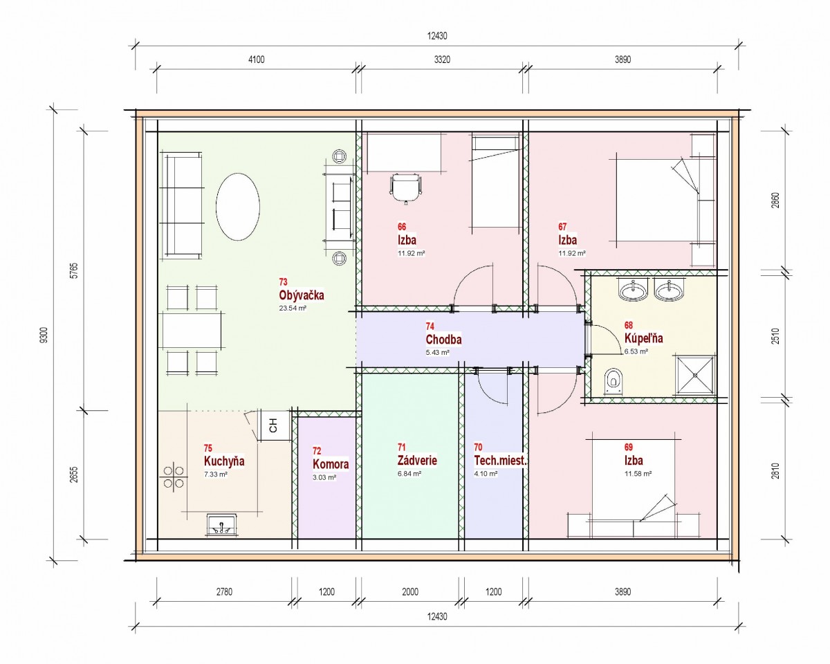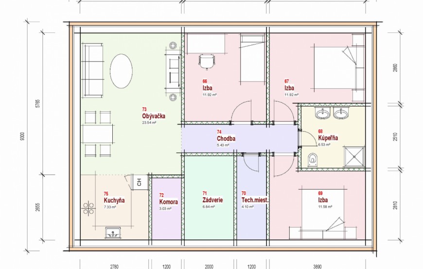 Dispozíciu domu tvorí kuchyňa, obývacia izba, 2xspálňa, kúpeľňa s WC. Z obývacej izby vedie výstup na terasu. Tento dom je možné objednať aj v bezbariérovom vyhotovení. Dom je vhodný do nízkej okolitej zástavby. Neobytné podkrovie môže slúžiť ako úložný priestor (v prípade sedlovej / valbovej strechy).