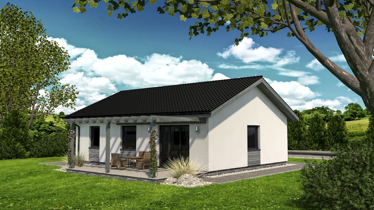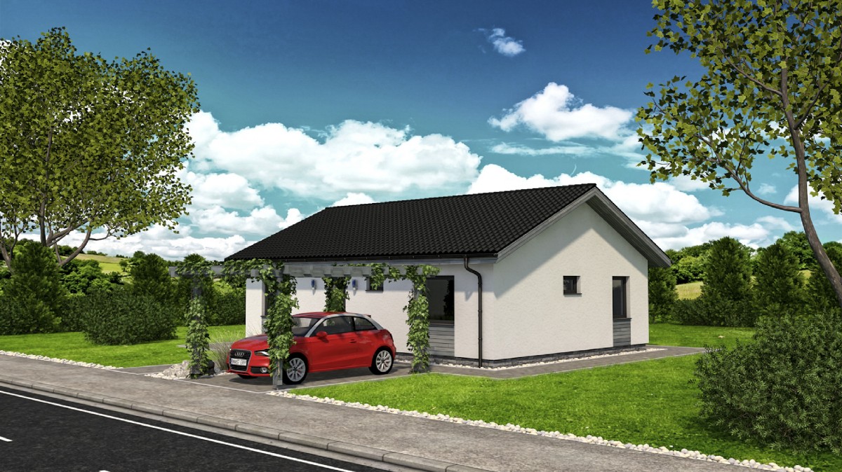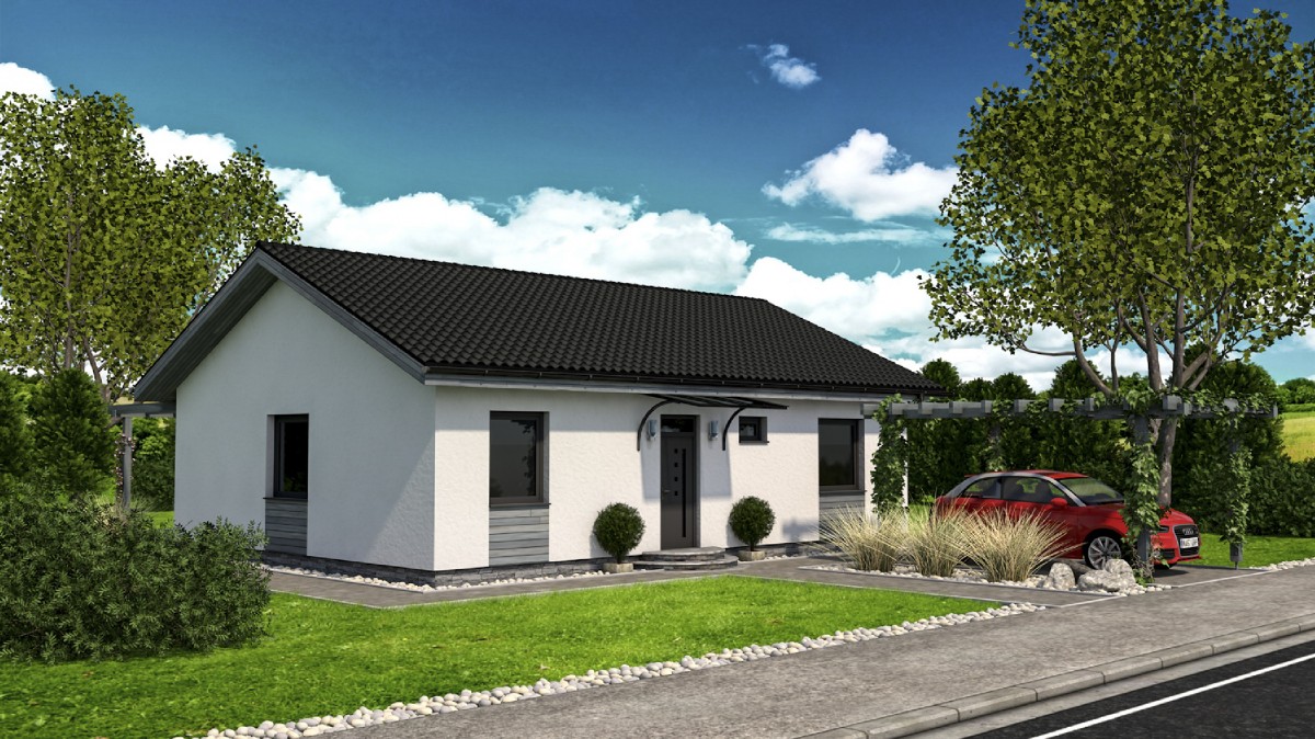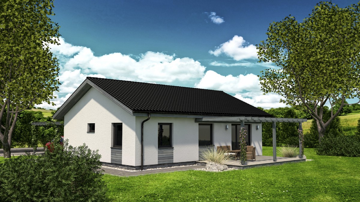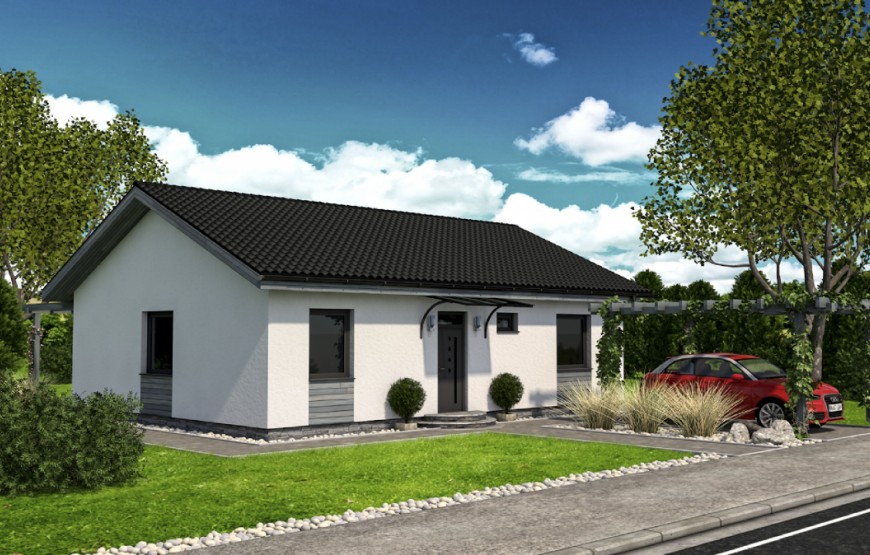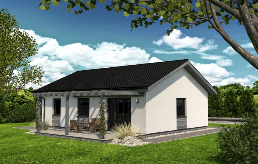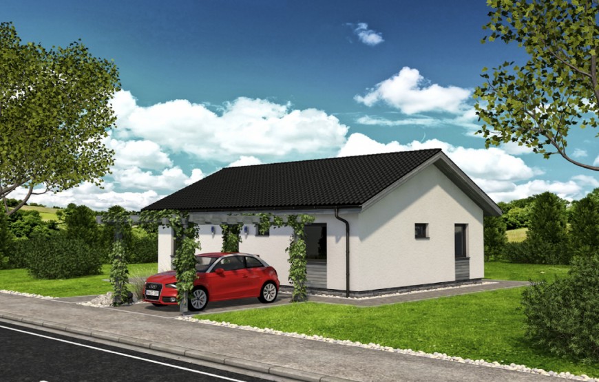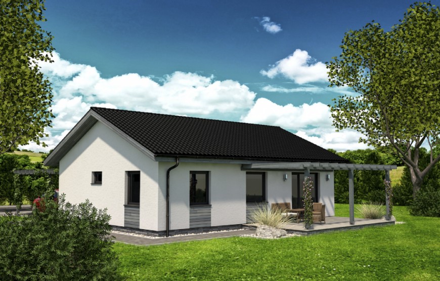 Samostatne stojaci prízemný rodinný dom FLEX 108 je vhodný do rovinatého, prípadne mierne svahovitého terénu. Je to dom malej veľkostnej kategórie určený pre 3-4 člennú rodinu, prípadne ako rodinný domček na dôchodok :-)