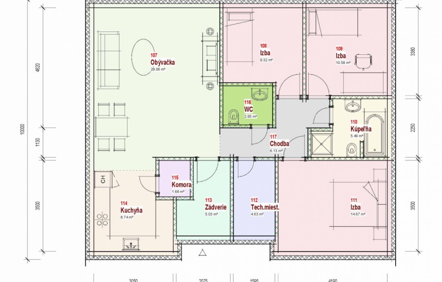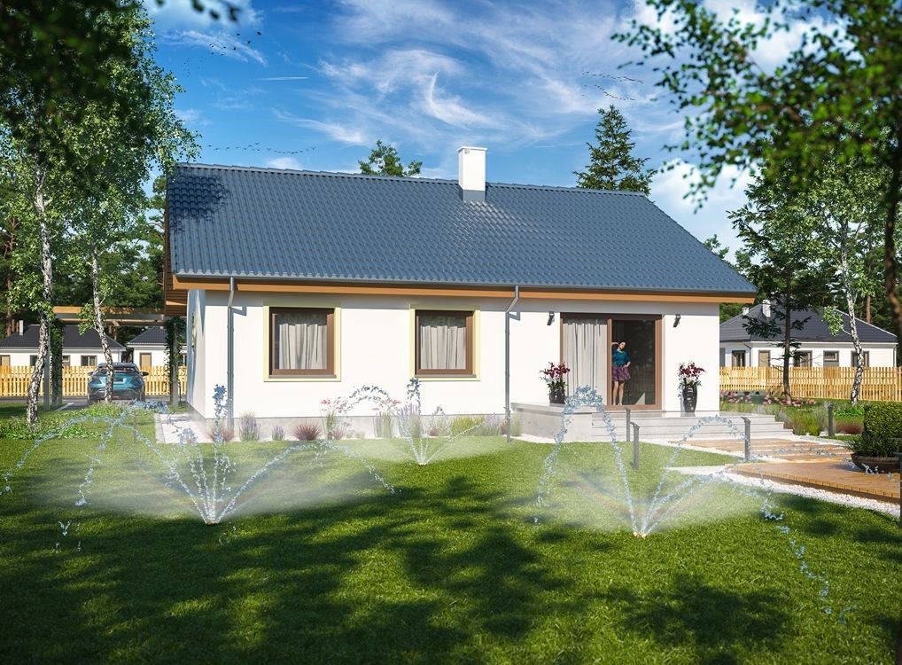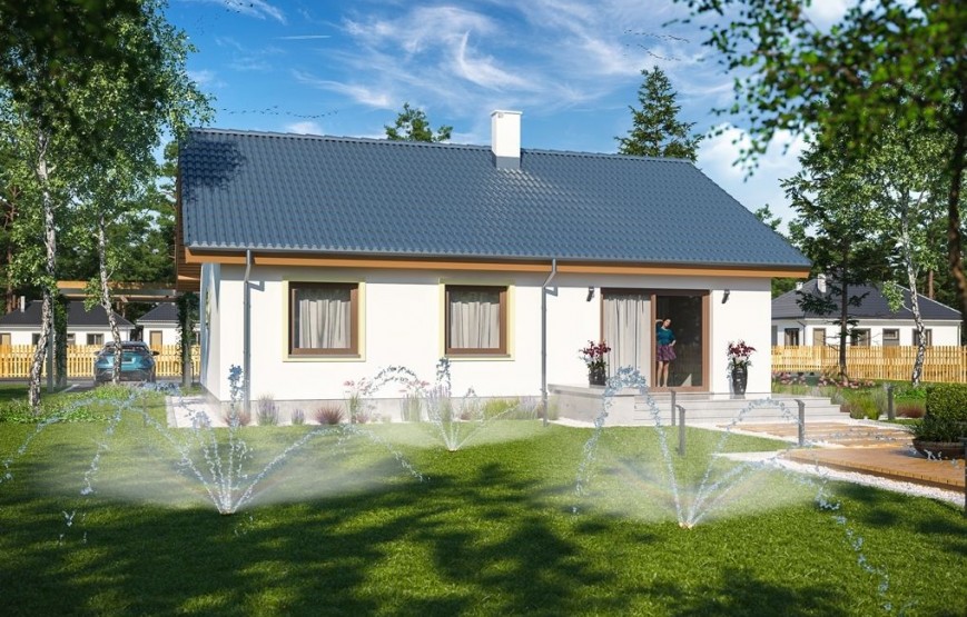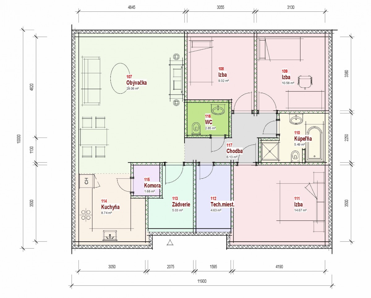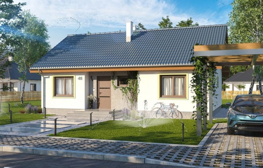 Samostatne stojaci prízemný rodinný dom FLEX 110 je vhodný do rovinatého, prípadne mierne svahovitého terénu. Je to strednej veľkostnej kategórie určený pre 4-5 člennú rodinu.