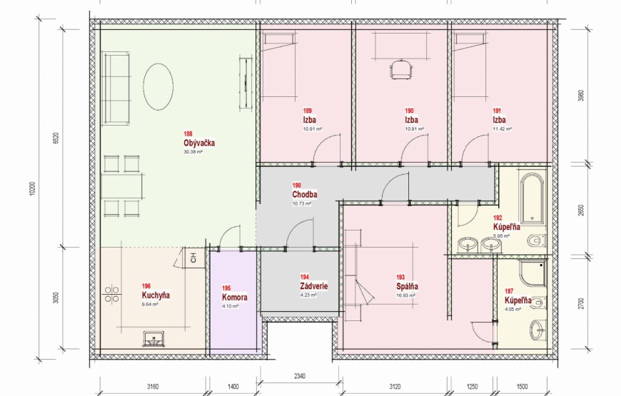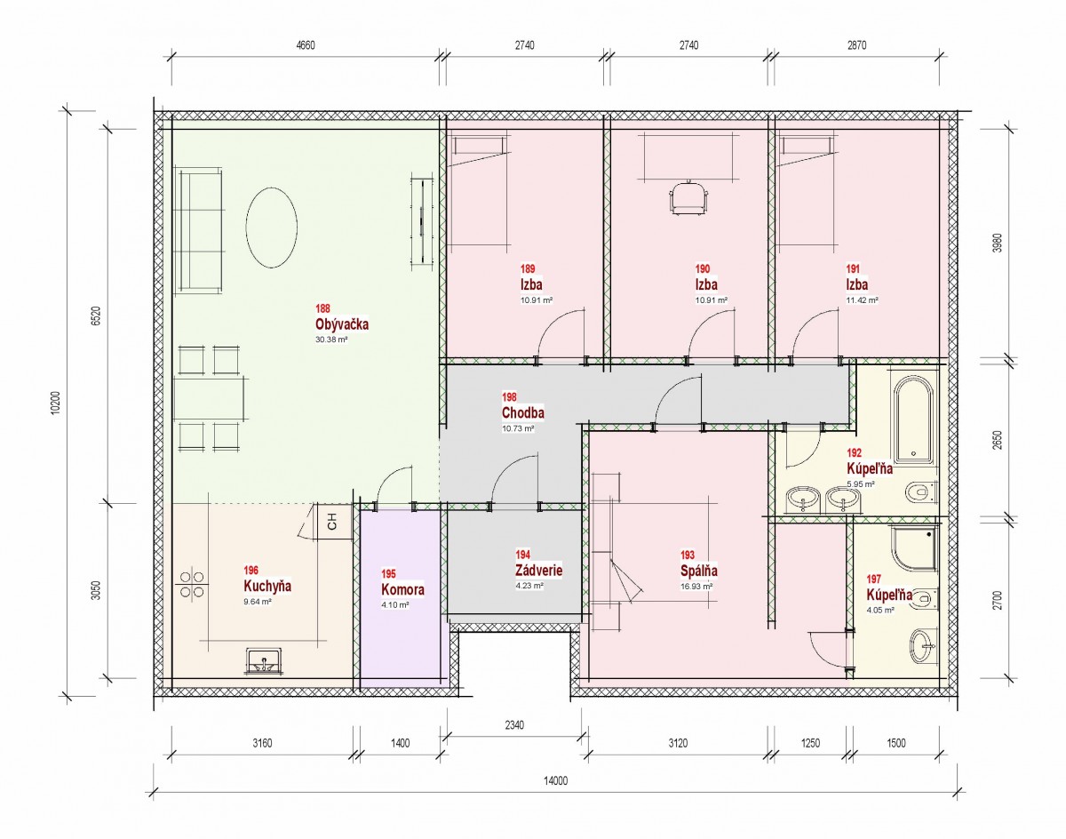 Dispozíciu domu tvorí kuchyňa, obývacia izba, 4xspálňa, 2 samostetné kúpeľne s WC. Z obývacej izby vedie výstup na terasu. Tento dom je možné objednať aj v bezbariérovom vyhotovení. Dom je vhodný do nízkej okolitej zástavby. Neobytné podkrovie môže slúžiť ako úložný priestor (v prípade sedlovej / valbovej strechy).