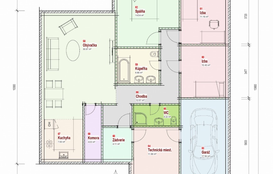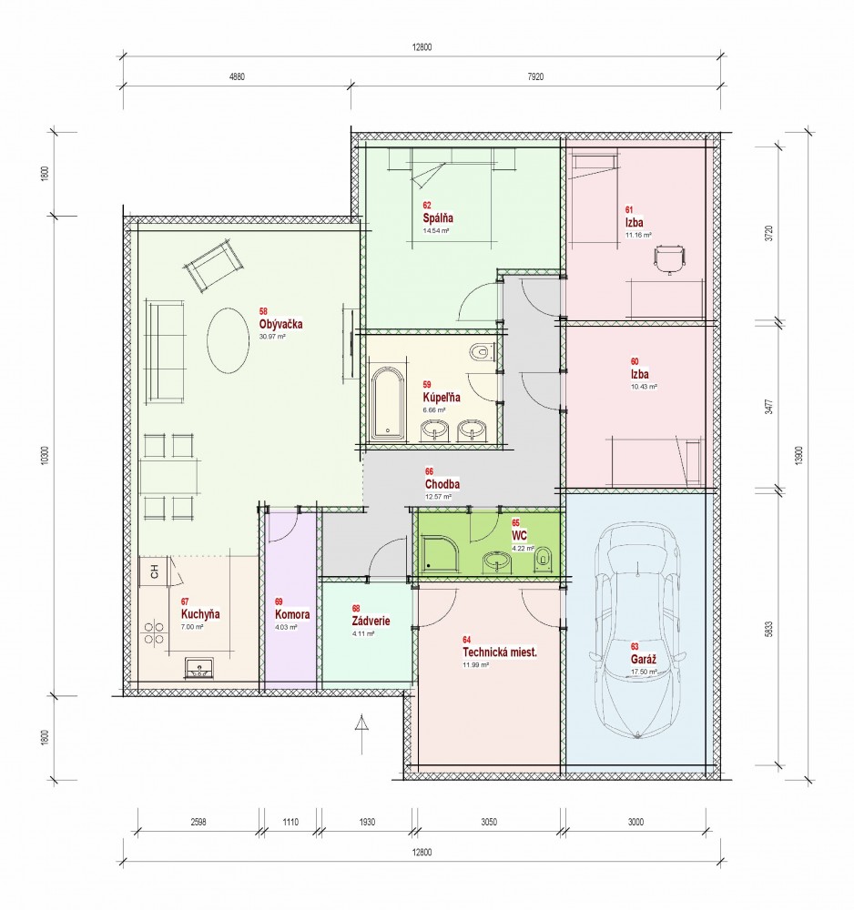 Dispozíciu domu tvorí kuchyňa, obývacia izba, 3xspálňa, kúpeľňa s WC. Z obývacej izby vedie výstup na terasu. Tento dom je možné objednať aj v bezbariérovom vyhotovení. Dom je vhodný do nízkej okolitej zástavby. Neobytné podkrovie môže slúžiť ako úložný priestor (v prípade sedlovej / valbovej strechy).
