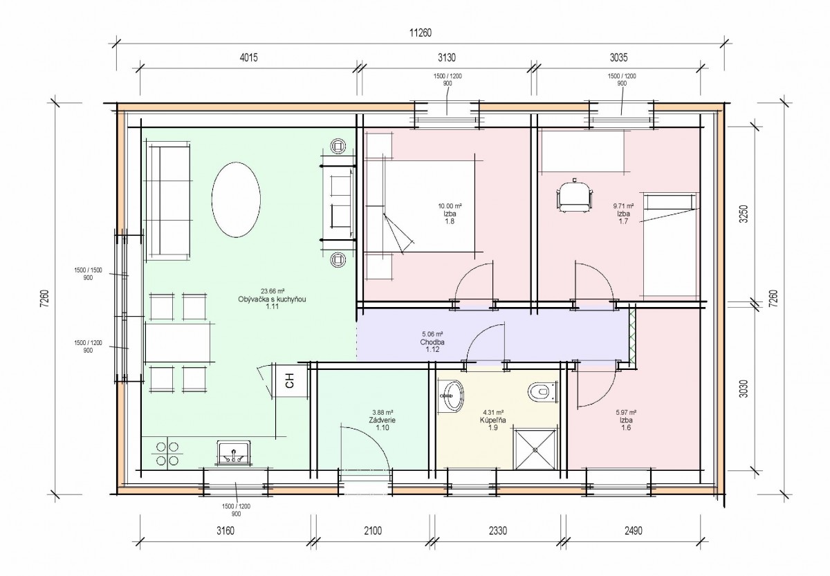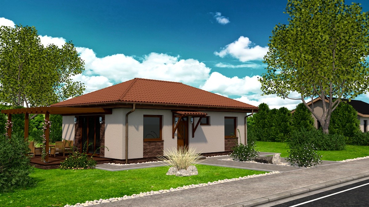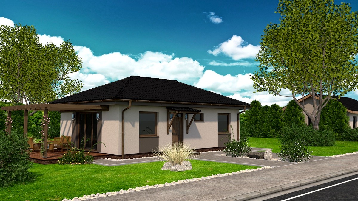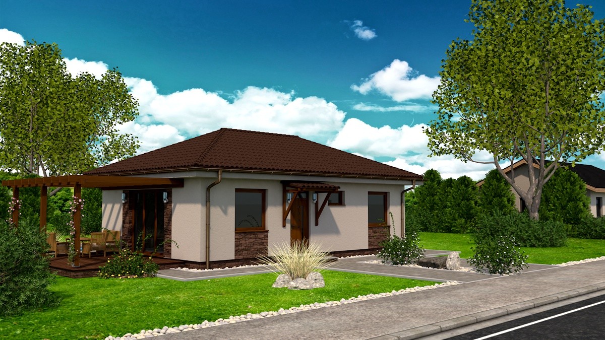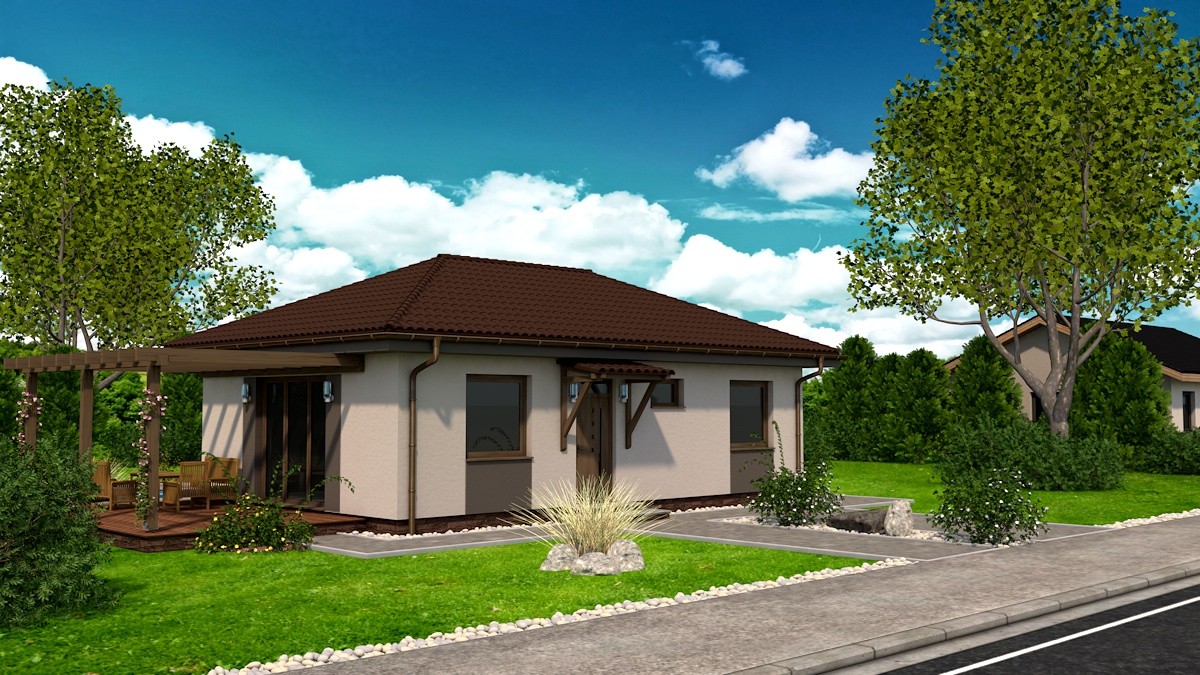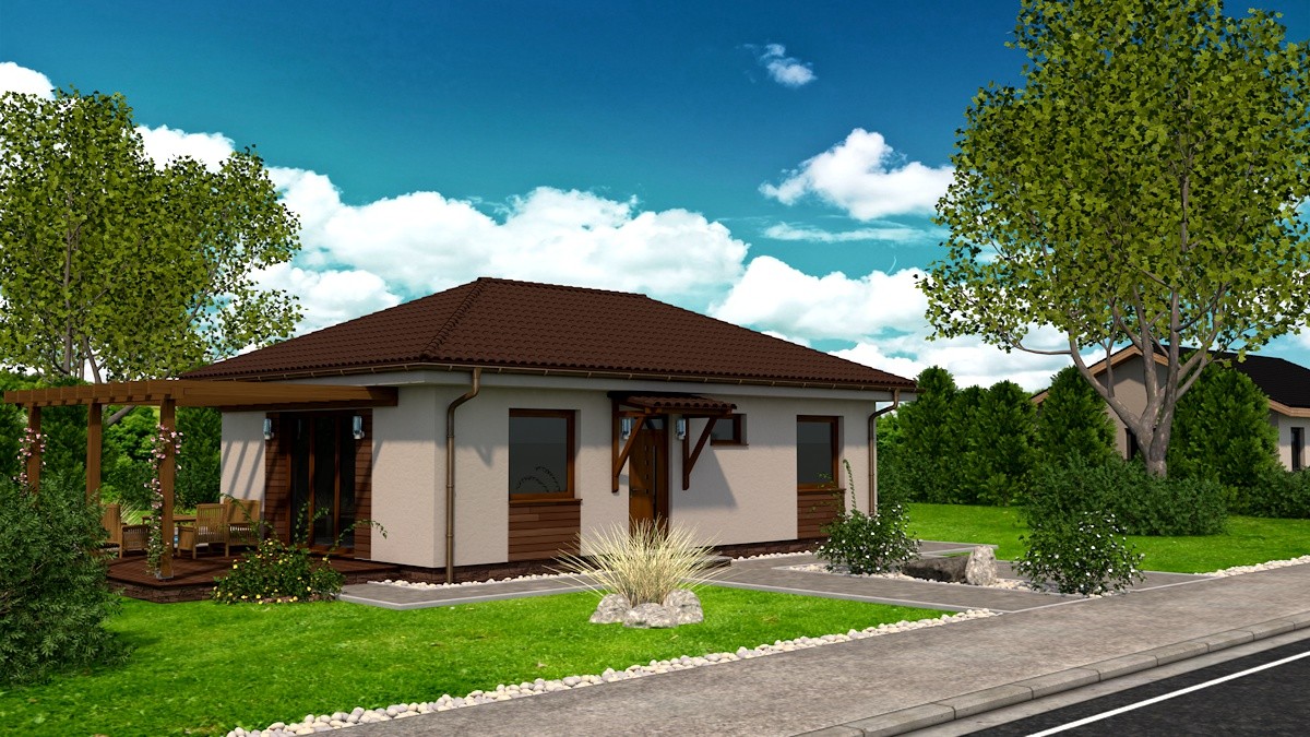 Samostatne stojaci prízemný rodinný dom FLEX 77 je vhodný do rovinatého, prípadne mierne svahovitého terénu. Je to dom malej veľkostnej kategórie určený pre 3-4 člennú rodinu, prípadne ako rodinný domček na dôchodok :-)