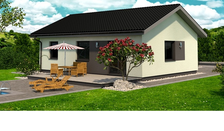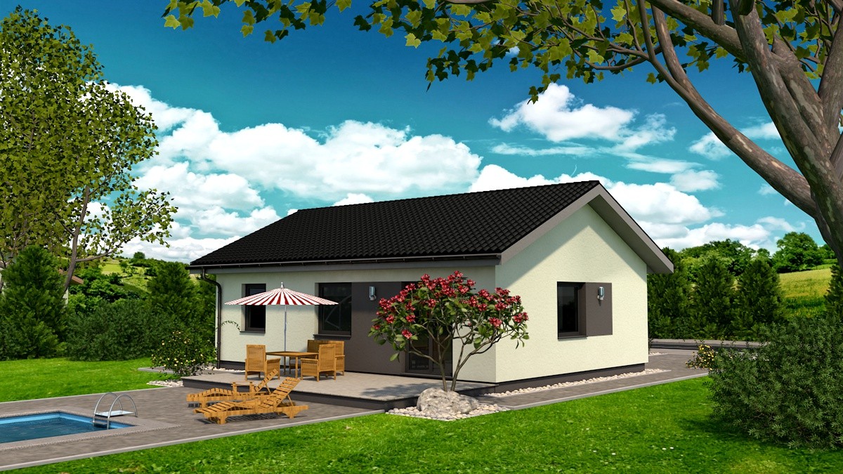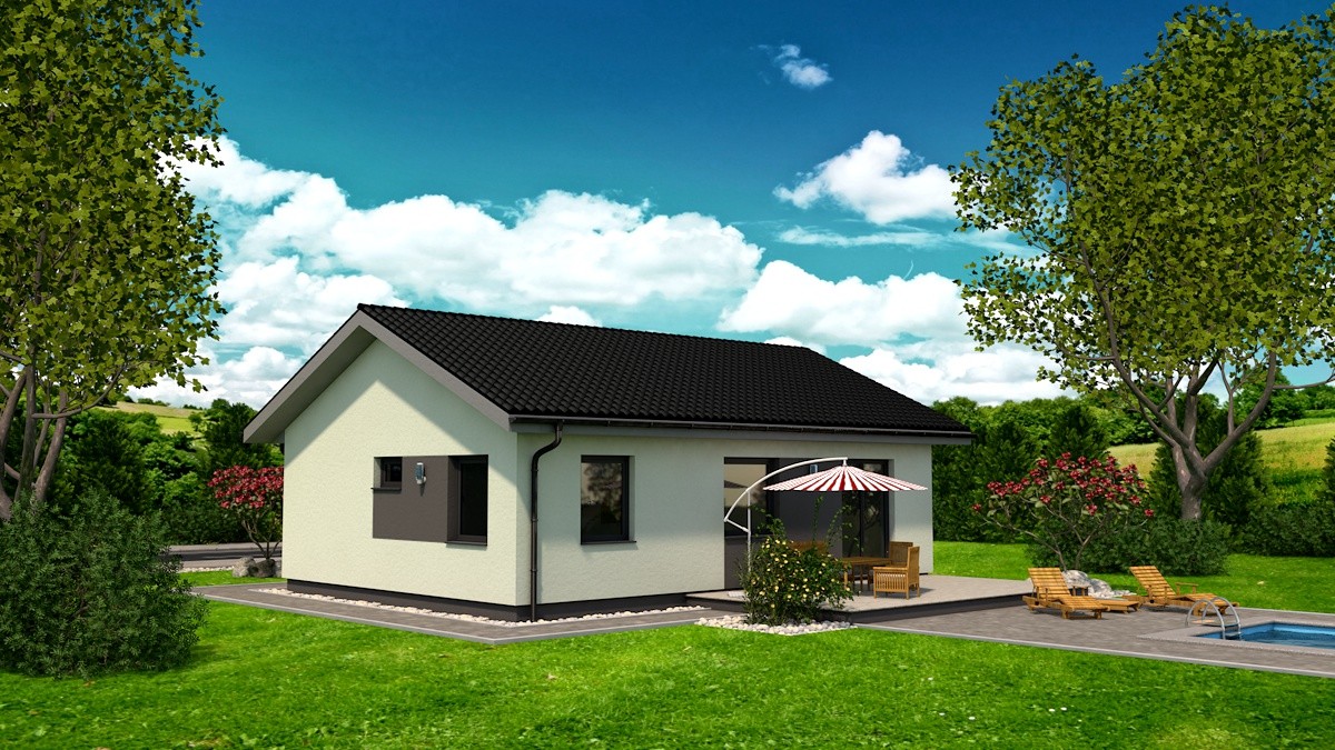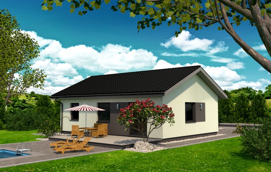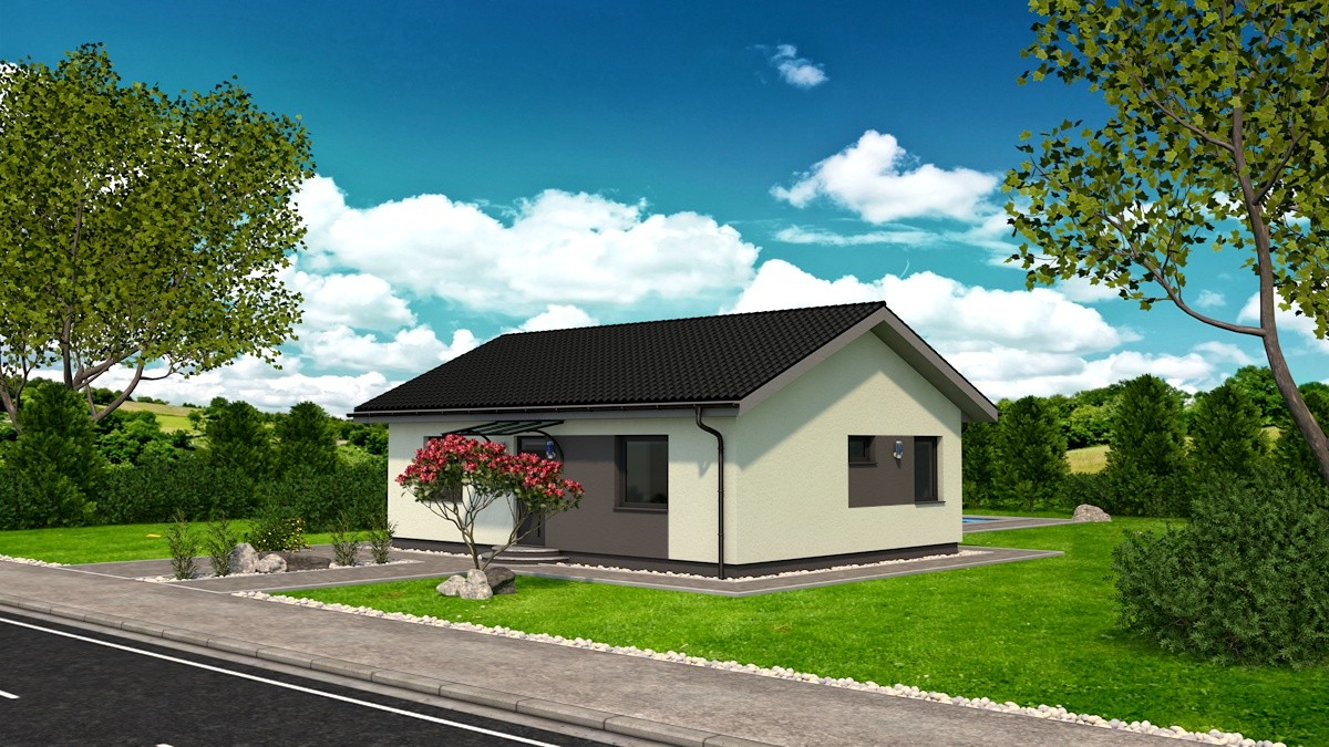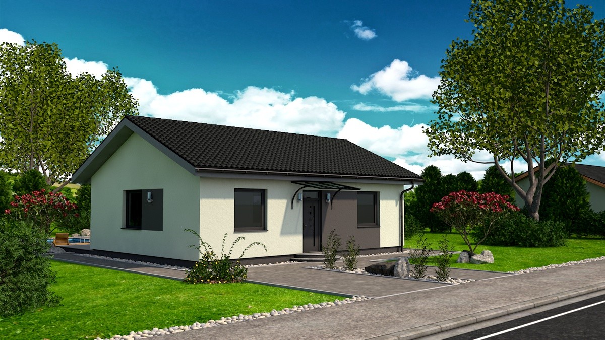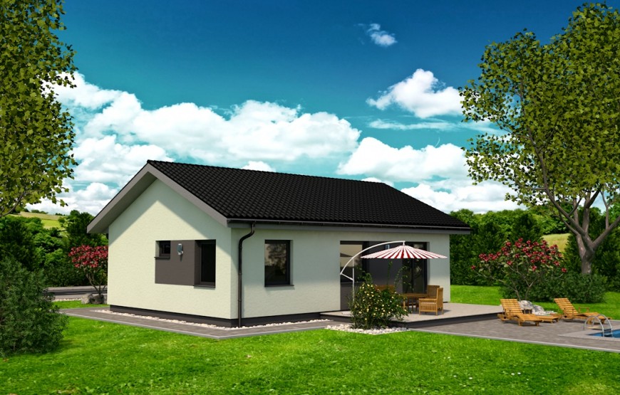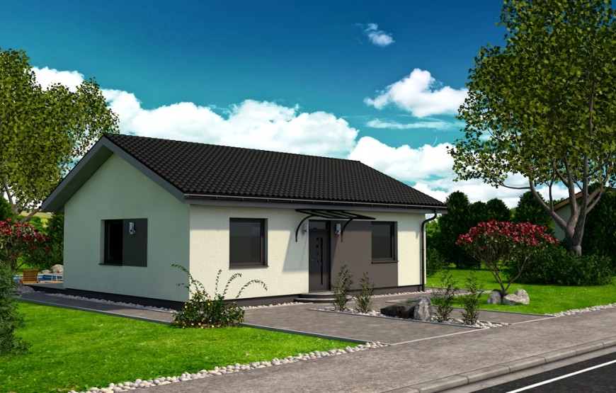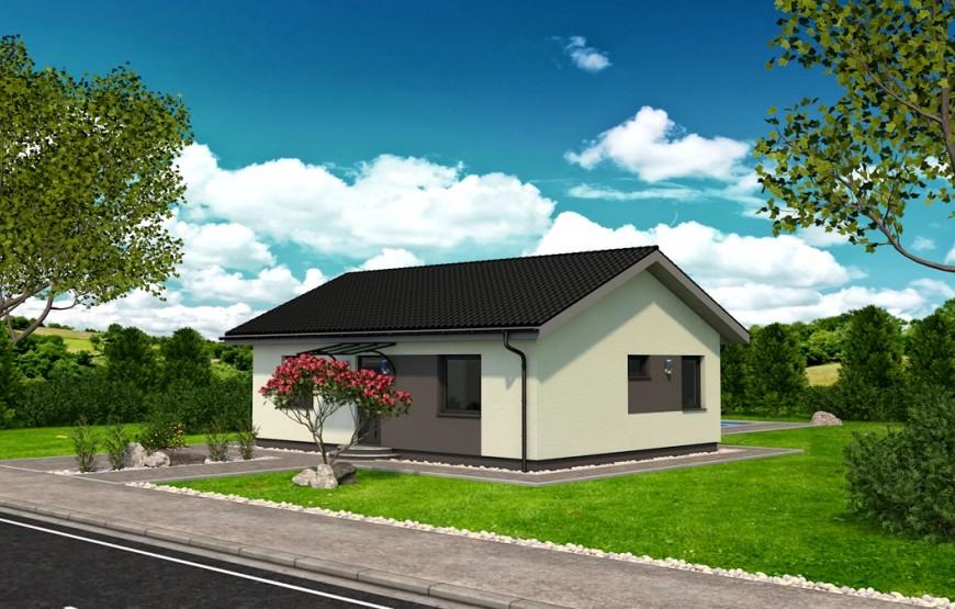 Samostatne stojaci prízemný rodinný dom FLEX 88 je vhodný do rovinatého, prípadne mierne svahovitého terénu. Je to dom malej veľkostnej kategórie určený pre 3-4 člennú rodinu, prípadne ako rodinný domček na dôchodok :-)
