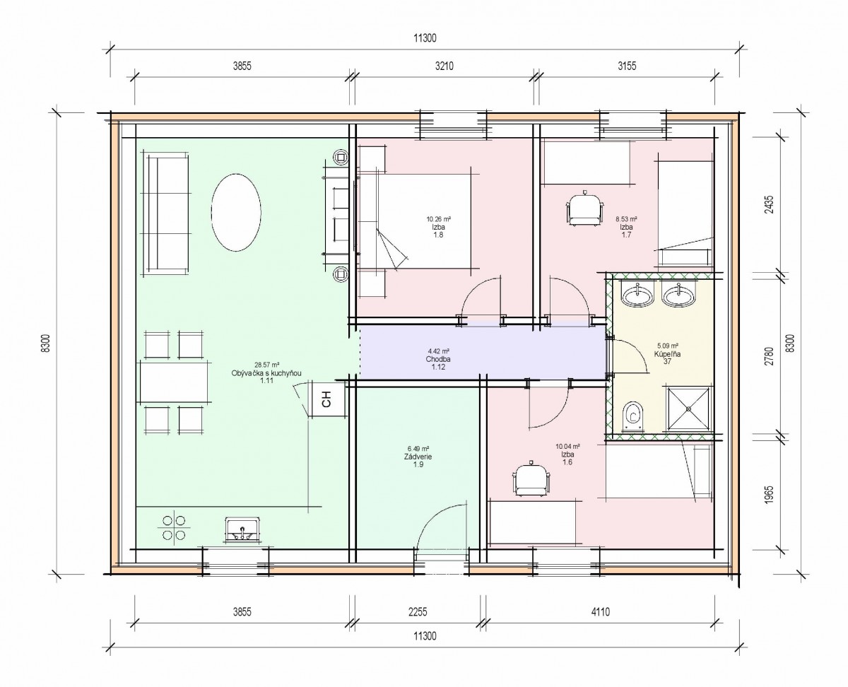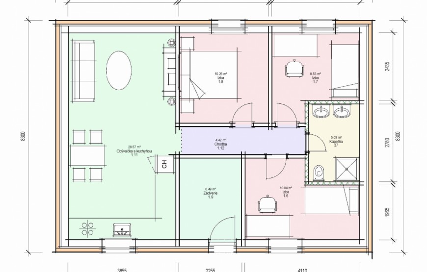 Dispozíciu domu tvorí kuchyňa, obývacia izba, 2xspálňa, kúpeľňa s WC. Z obývacej izby vedie výstup na terasu. Tento dom je možné objednať aj v bezbariérovom vyhotovení. Dom je vhodný do nízkej okolitej zástavby. Neobytné podkrovie môže slúžiť ako úložný priestor (v prípade sedlovej / valbovej strechy).