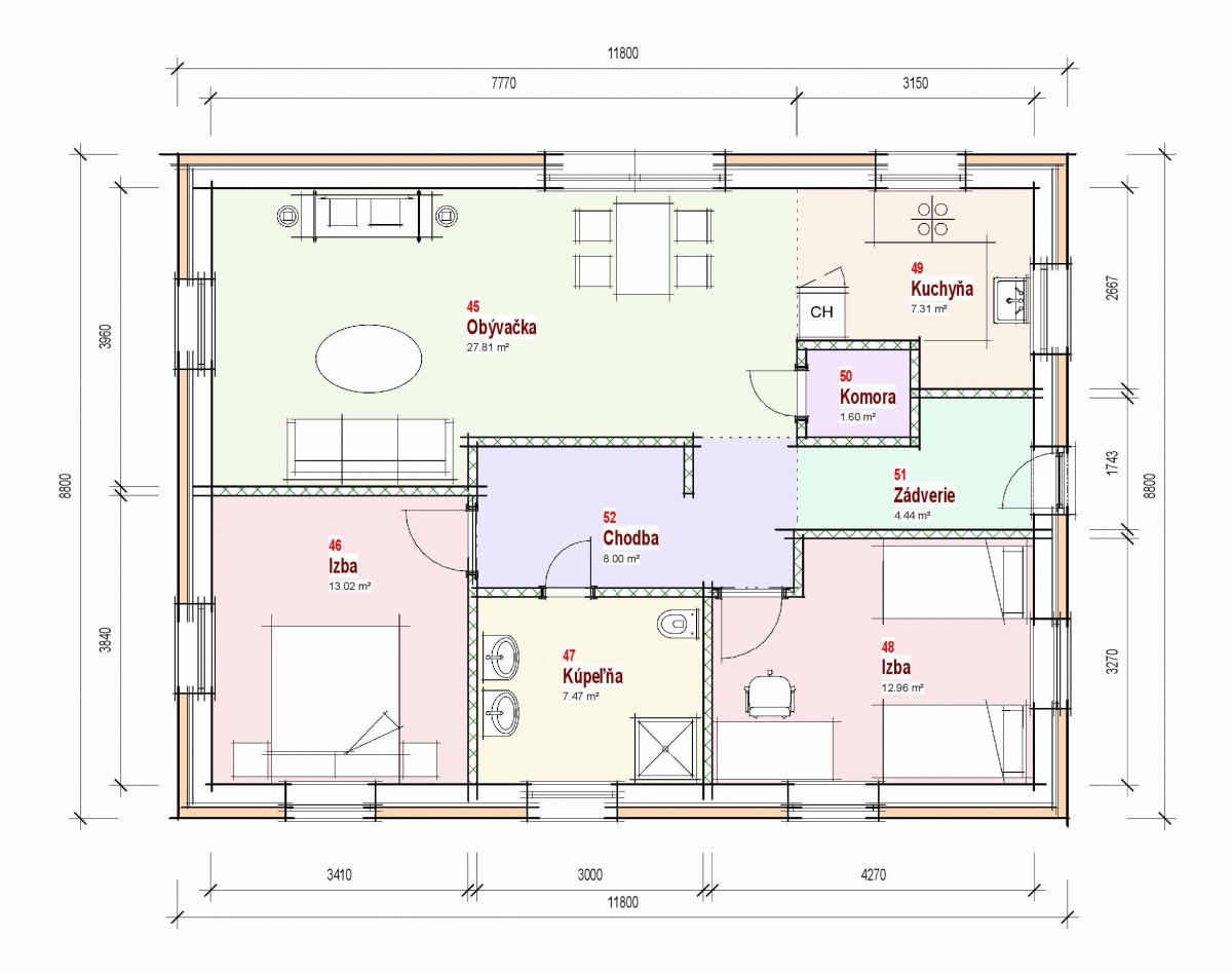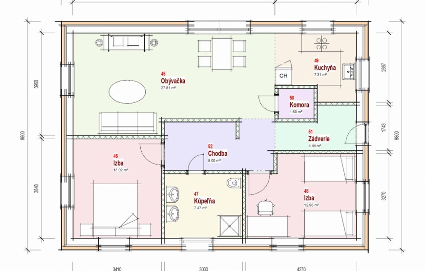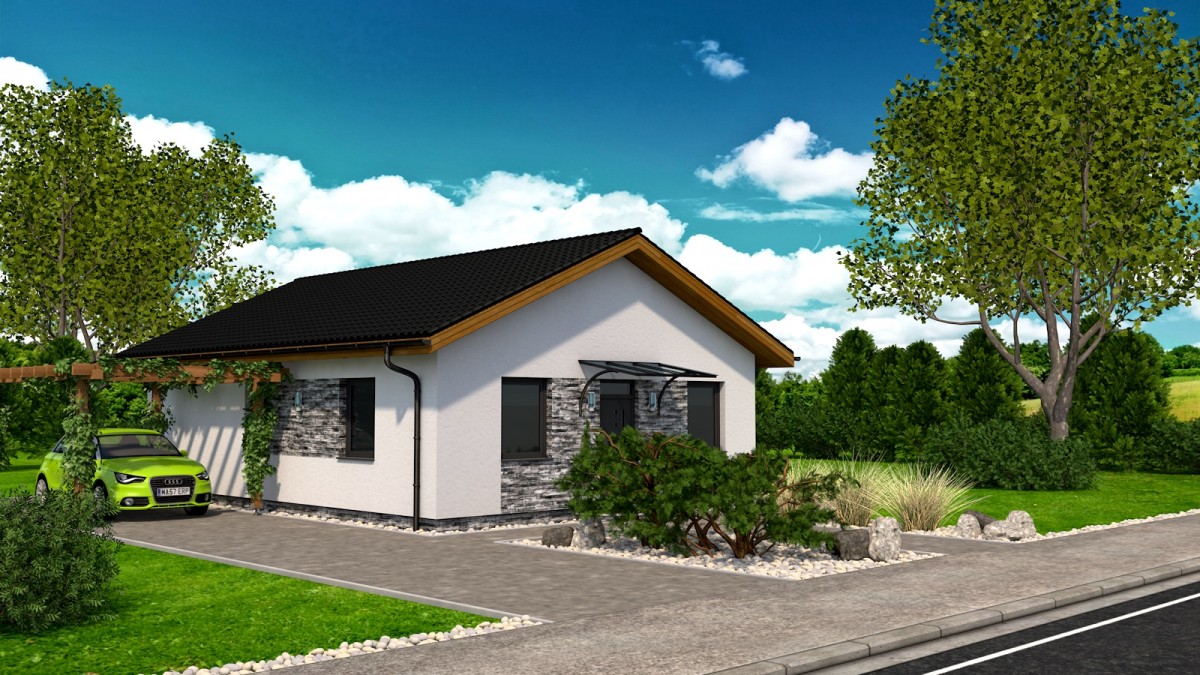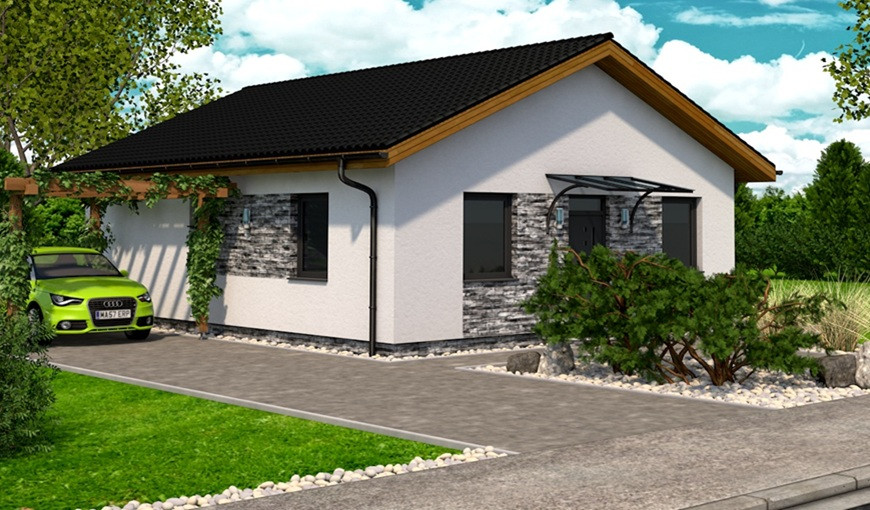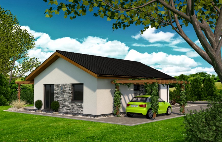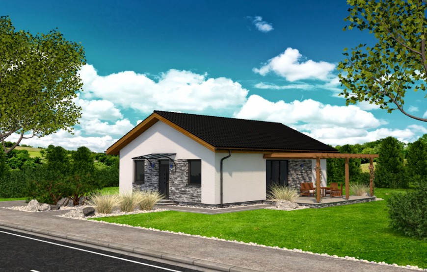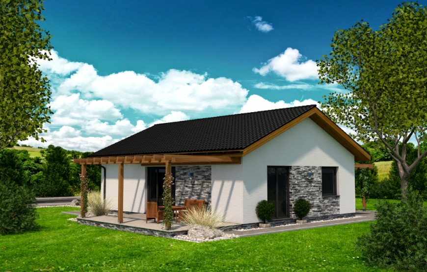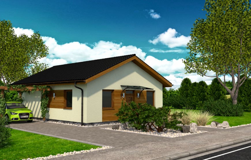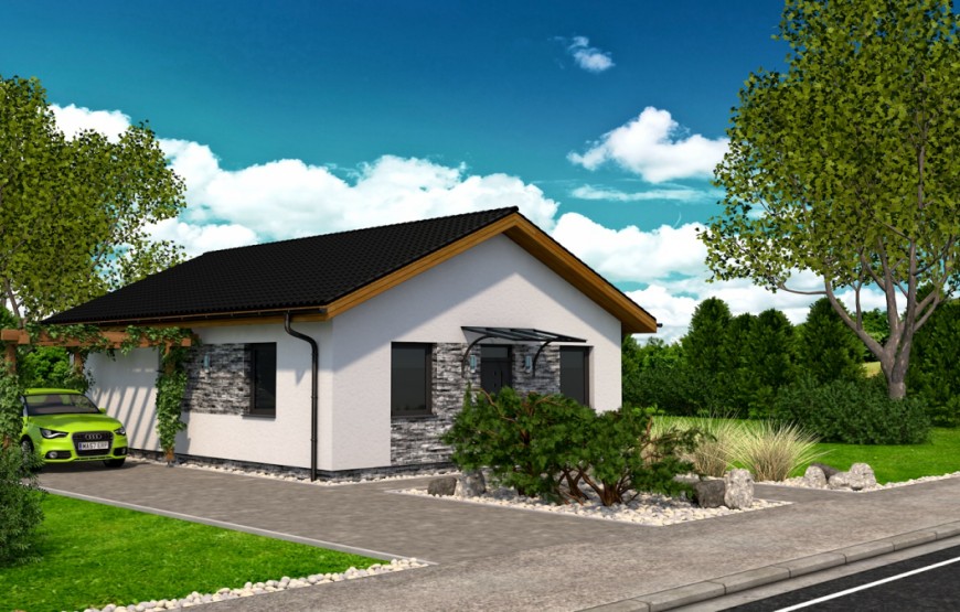 Dispozíciu domu tvorí kuchyňa, obývacia izba, 2xspálňa, kúpeľňa s WC. Z obývacej izby vedie výstup na terasu. Tento dom je možné objednať aj v bezbariérovom vyhotovení. Dom je vhodný do nízkej okolitej zástavby. Neobytné podkrovie môže slúžiť ako úložný priestor (v prípade sedlovej / valbovej strechy).