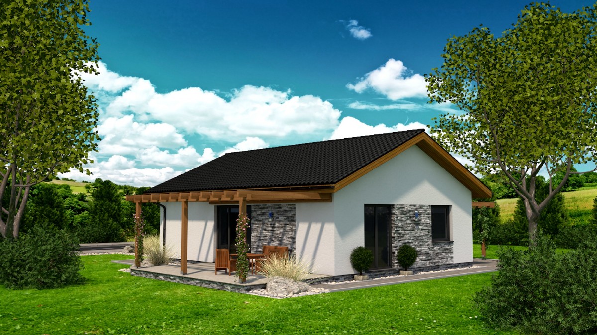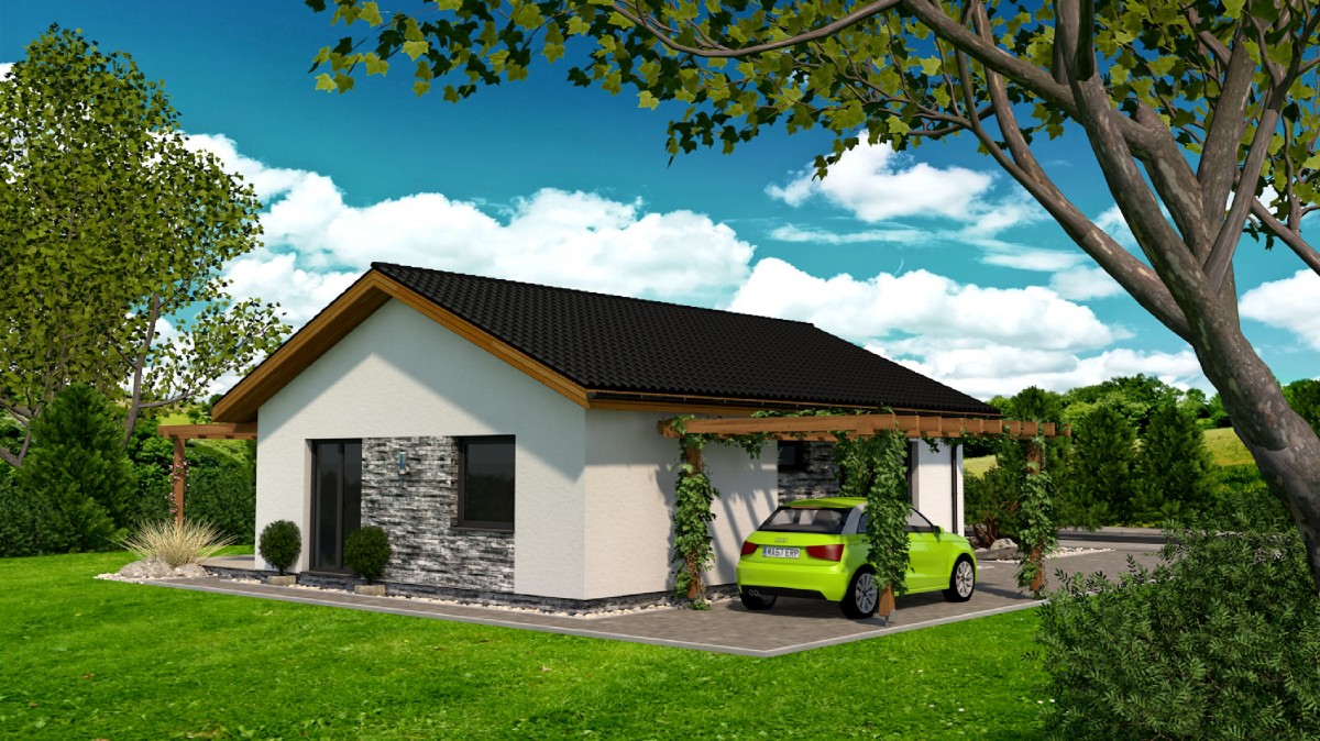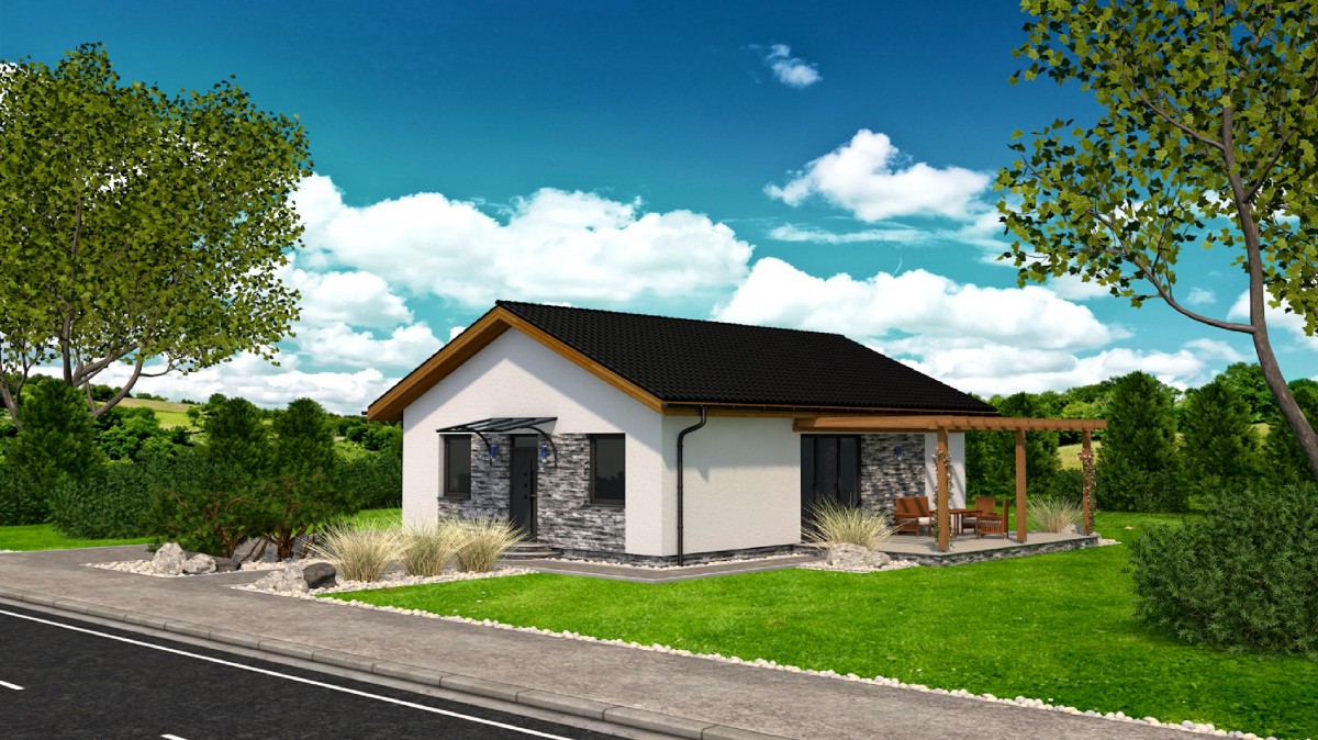 Samostatne stojaci prízemný rodinný dom FLEX 98 je vhodný do rovinatého, prípadne mierne svahovitého terénu. Je to dom malej veľkostnej kategórie určený pre 3-4 člennú rodinu, prípadne ako rodinný domček na dôchodok :-)